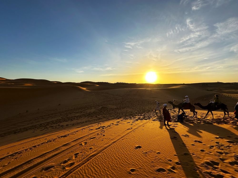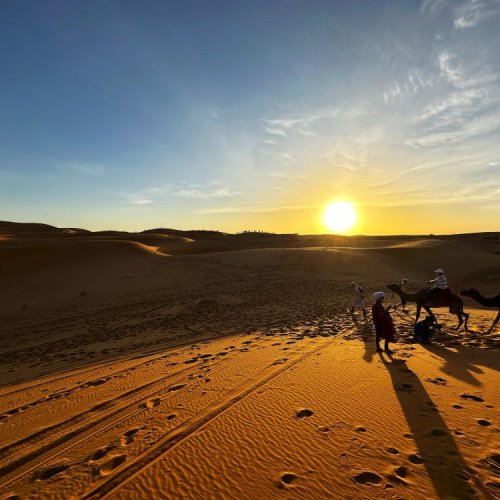 Ни одно посещение Марокко не будет полным, если Вы не увидите красоту пустыни Сахара. Приготовьтесь открыть для себя другую сторону Марокко. Mы отправимся в сторону Мерзуги через Мидельт и долину Зиз. Проедем мимо курортного городка Ифран, основанного французами во время протектората и называемому "марокканской Швейцарией" из-за европейской природы и климата, парков с озерами и величественных атласских кедров. Короткая остановка в Азроу, где Вы можете увидеть обезьян Барбари в кедровом лесу Среднего Атласа. После этого наше путешествие продолжится в Мидельт вдоль великолепных холмов и гор. Мы проедем через захватывающий перевал и ущелье Зиз, любуясь видом на плато Высокого Атласа и наблюдая, как меняется пейзаж по мере приближения к провинции юго-восточная Эр-Рашидия. А затем, путешествуя по фантастической долине Зиз, будем любоваться панорамными видами по пути в Эрфуд и Риссани. В этот день нас ждут невероятные приключения! Сначала мы совершим настоящий серфинг на полноприводных автомобилях по пустыне Сахара! Продолжим путь в Мерзугу через Мидельт, где остановимся на вкусный обед, и Эр-Рашидию, с остановкой в небольшом курортном городке Эрфуд, который часто называют «воротами в Сахару». Прибытие в Мерзугу - небольшой город недалеко от границы с Алжиром, на самом краю пустыни Сахара. Здесь Вы увидите очень сложную и необычайно древнюю систему ирригации – Khetara. Считается, что она появилась 3 тысячелетия назад на территории Персии (нынешние Иран и Афганистан). В Мерзугe нас встретят чашечкой ароматного мятного чая и пересев на верблюдов, под руководством опытного гида, мы отправимся вглубь пустыни в таинственное море песка. Мы будем загипнотизированы меняющими форму дюнами Эрг-Шебби, когда розово-золотые дюны резко возвышаются над серой хамадой и необычайно живописными цветами песков от оранжевого и розового до фиолетового на закате солнца, который мы встретим верхом на верблюдах! Комфортное размещение на ночь в берберском лагере De Luxe 5*. Во время вечерних посиделок у костра и вкусного ужина из традиционных марокканских блюд: мишуи, кускус, харира - Вы в полной мере ощутите неповторимый колорит жизни вблизи самой большой в мире пустыни. В этот вечер Вы услышите музыку туарегов, которых называют «синие люди». А главное, будете любоваться красивейшим ночным небом, ведь в Сахаре звезды кажутся гораздо ярче и ближе!